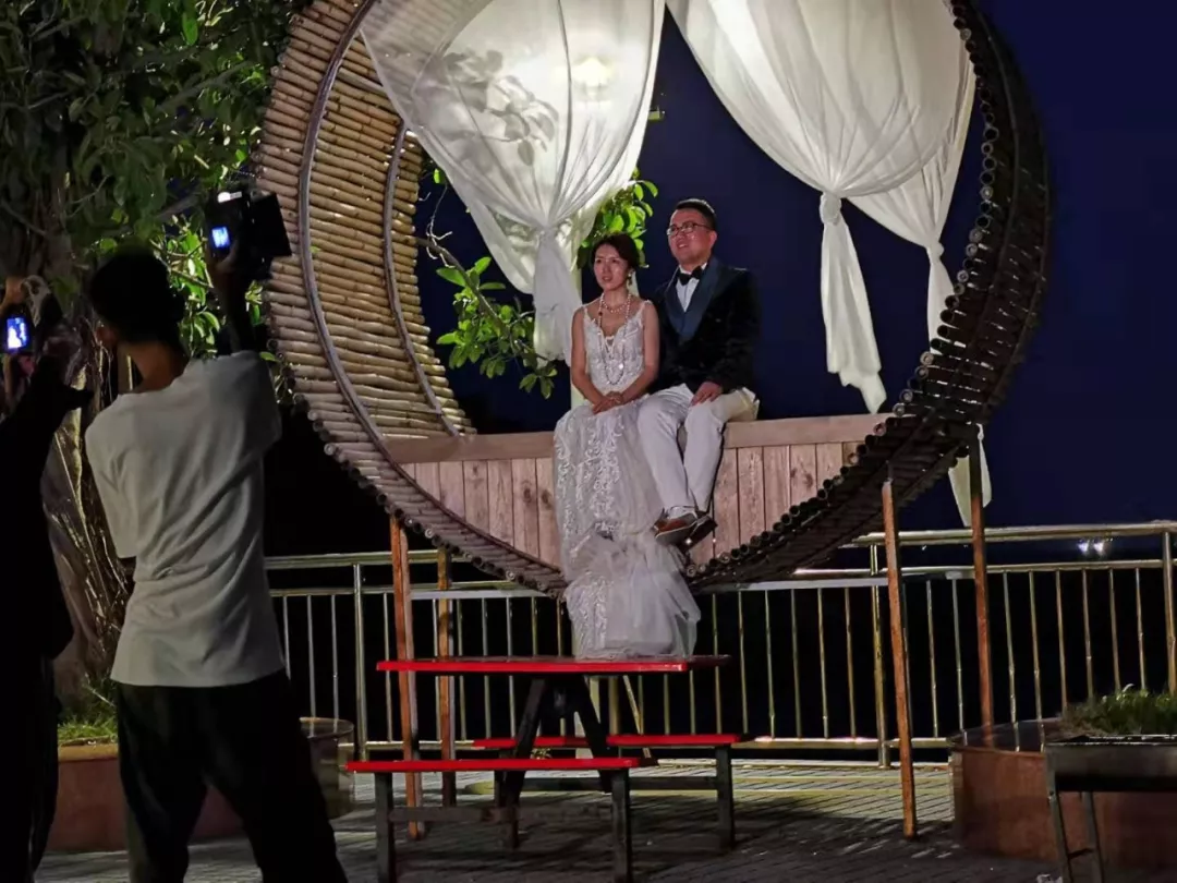 有幾對新人忙著(zhù)將美景定格在自己的婚紗照中,引來(lái)了不少游客羨慕的目光。